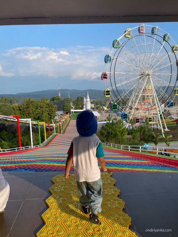 Nah, wahana permainan ini ada yang ‘lembut’ dan ada yang menantang. Ini adalah kali pertama saya mencoba wahana permainan rainbow slide. Ya karena anak saya teguh mau mencoba sedangkan tak ada orang lain selain saya, ibunya, yang harus menemaninya. 😀